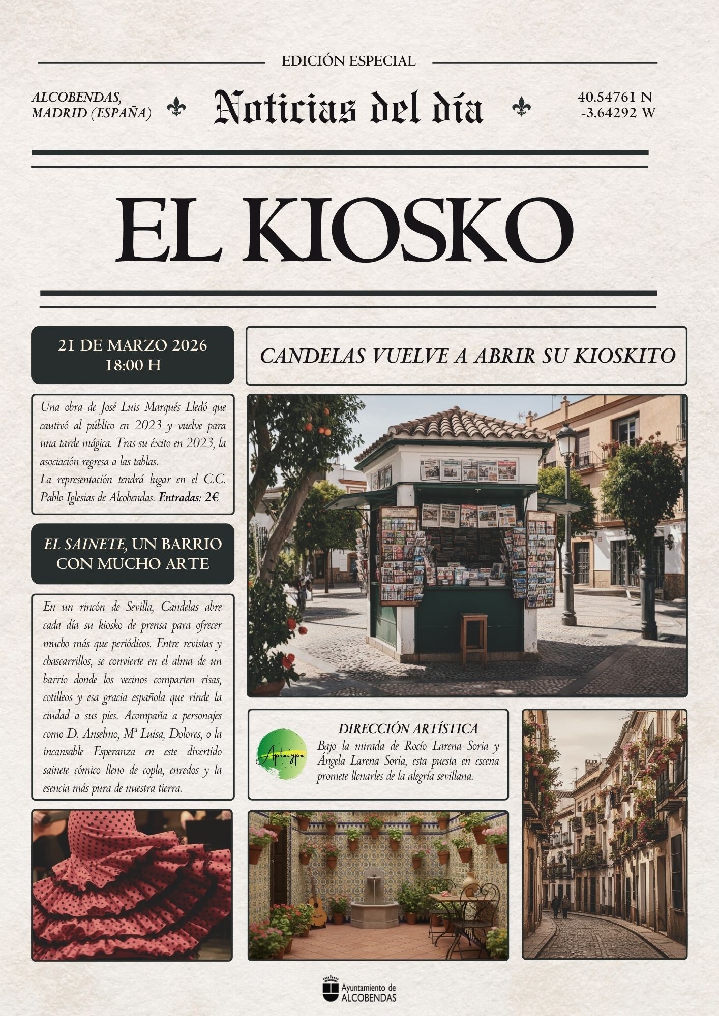 Tras el gran éxito cosechado en la Muestra de Teatro Local de Alcobendas en 2023, Aptecype regresa a las tablas para presentarnos de nuevo “El Kiosko”. Este divertido sainete de José Luis Marqués Lledó, bajo la dirección de las hermanas Rocío y Ángela Larena Soria, nos traslada a un barrio cualquiera de Sevilla. Allí, entre periódicos, risas y algún que otro chisme, conoceremos a Candelas, la quiosquera, y a sus singulares vecinos. Una obra llena de gracia, enredos y la esencia más pura de nuestra tierra que ya cautivó al público en 2023. ¡Ozú, la que se viene encima! ¿Te lo vas a perder?